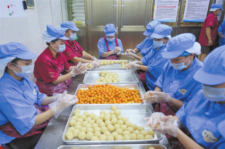 这样的忙碌,从入秋就开始了。在李家月饼的生产车间里,烤盘换了一茬又一茬,刚出炉的月饼还冒着热气,酥皮轻轻一碰就簌簌往下掉。“中秋这几天,一天最少卖一万个月饼,高峰期可达三万个。”该店负责人黄丹介绍,“师傅们包月饼的手艺,已经坚持了很多年。”