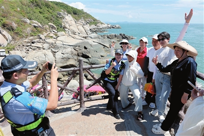 该女士的提议很快引发了“连锁反应”。合影结束后,周围的小朋友纷纷围了上来,仰着小脸喊道:“我们也想跟警察叔叔和姐姐合影……”黄立和曹雪瑞笑着蹲下身子,配合孩子们摆出可爱的姿势,快门声此起彼伏。合影过后,两人又主动拿起游客的手机,当起了临时摄影师,帮大家捕捉与海岛美景的同框瞬间,镜头里的笑容格外灿烂。
