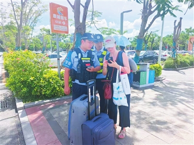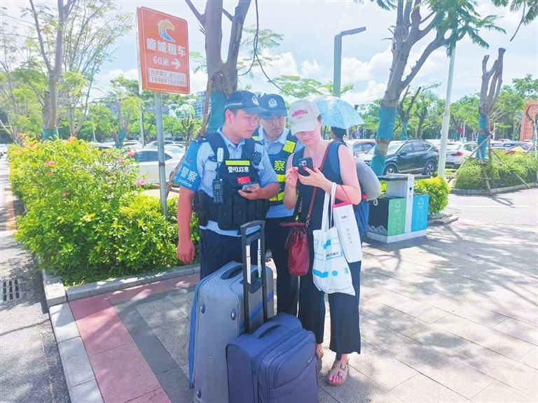 当日12时30分许,在三亚火车站,一位俄罗斯籍女游客面露难色,由于语言不通,她多番尝试在手机上下单呼叫网约车,但均未成功。于是,她向正在附近巡逻的天涯分局友谊派出所副所长何保富、队员何积龙求助。见状,何保富立即上前,拿出自己的手机打开翻译软件,耐心地与其沟通。当得知该游客要前往工业园路某酒店,民警一步步帮其在手机上输入目的地、选择车型,直至下单成功。车辆抵达后,该游客用不太流利的中文连声说:“中国朋友非常好!”民警笑着挥手回应:“欢迎俄罗斯朋友常来中国玩!”简单的对话,温暖的瞬间,服务跨越了语言障碍。