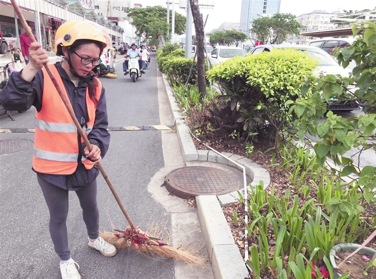 金秋十月,三亚洋溢着浓厚的节日氛围。10月8日下午,在熙熙攘攘的天涯区胜利路上,一抹亮眼的橘色身影在持续忙碌着——年近不惑的陈娟正手持扫帚,与片区组长林武儿一同躬身清扫路面。