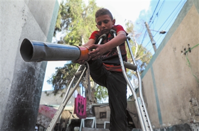 10月5日,年仅10岁的少年拉提卜·阿布·卡里克在加沙地带中部代尔拜拉赫附近的联合国临时安置机构内拄着拐杖安装假肢。在数月前的一次以色列空袭中,拉提卜失去了右腿致残,他的母亲和兄弟也在袭击中身亡。