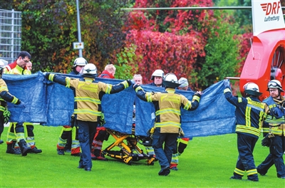 10月7日,在德国黑尔德克市,消防员和救援人员运送受重伤的该市新当选市长伊丽丝·斯塔尔泽。