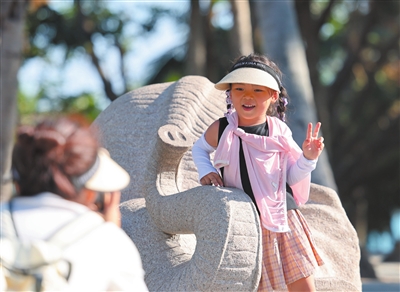 10月8日,家长带着孩子在海南三亚南山文化旅游区游玩。