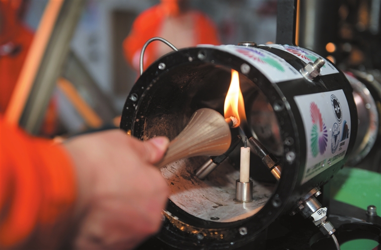 9月18日,在南海北部海域,我国自主研发的“海马”号深海遥控潜水器(ROV)搭载“可燃冰原位采集分解及引燃装置”下潜到1500多米深海底,科研人员远程操控采集可燃冰,并降压使其分解,产生的甲烷气体即为“源火”气源。随后,科考船甲板面的太阳能光伏装置发电并传输到海底,引燃气源获取“源火”。“海马”号携带燃烧的“源火”返回科考船甲板面后,科研人员将“源火”转移至“源火”盒,“源火”采集成功。