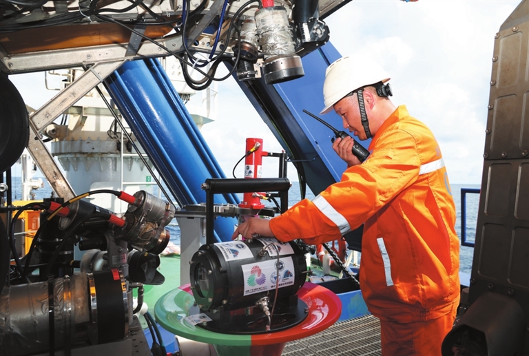 | 下水采集“源火”前,工作人员在调整搭载在“海马”号深海遥控潜水器上的采火装置(9月18日摄)。 |