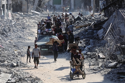 10月10日,在加沙地带南部汗尤尼斯,巴勒斯坦人从建筑废墟旁经过。新华社/路透