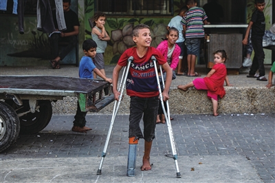 10月5日,年仅10岁的少年拉提卜·阿布·卡里克在加沙地带中部代尔拜拉赫附近的联合国临时安置机构内拄着拐杖行走。