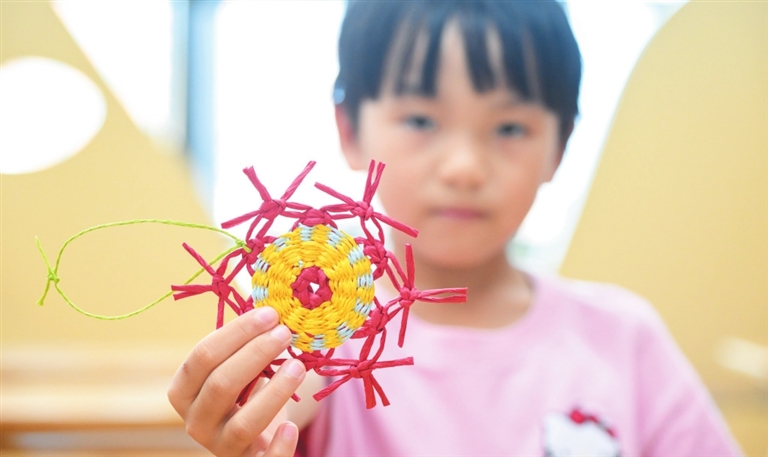 10月12日,在海南省文化馆,小朋友展示自己的东山草编技艺作品。