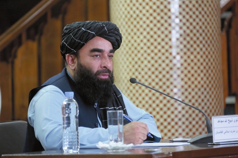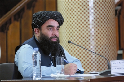 10月12日,阿富汗政府发言人扎比乌拉·穆贾希德在首都喀布尔举行的记者会上发言。