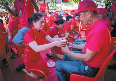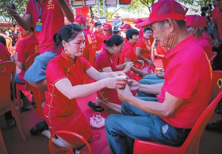 “双节”假期,陵水黎族自治县提蒙乡马村村举办首届“‘外嫁女’国庆中秋‘回娘家’”活动,近500名马村“外嫁女”盛装回村,在孝老敬亲仪式上为父母敬茶,与家人共庆佳节、共享团圆。
