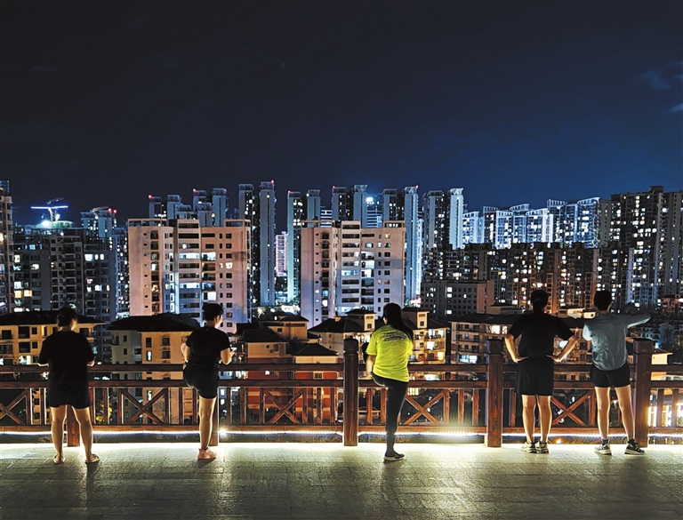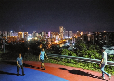 10月14日晚,市民、游客在临春岭森林公园运动后边放松肌肉边观看夜景。