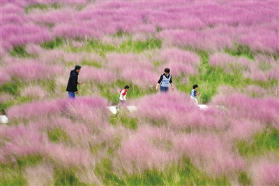 10月17日,游客在山东省烟台市黄渤海新区海螺广场粉黛花海游玩。