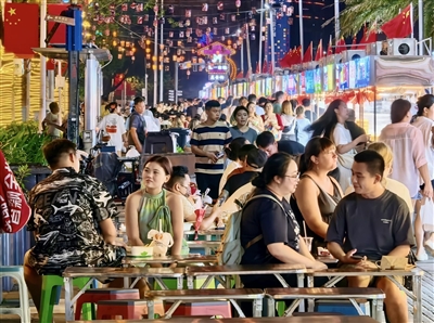 近日,三亚第一市场缤纷四季夜市迎来众多市民游客。夜市内,各摊位灯火通明,人流熙攘。市民游客或悠闲漫步,或品尝特色小吃,或挑选心仪商品,现场处处洋溢着热闹的烟火气息。 本报记者 刘琪成 摄