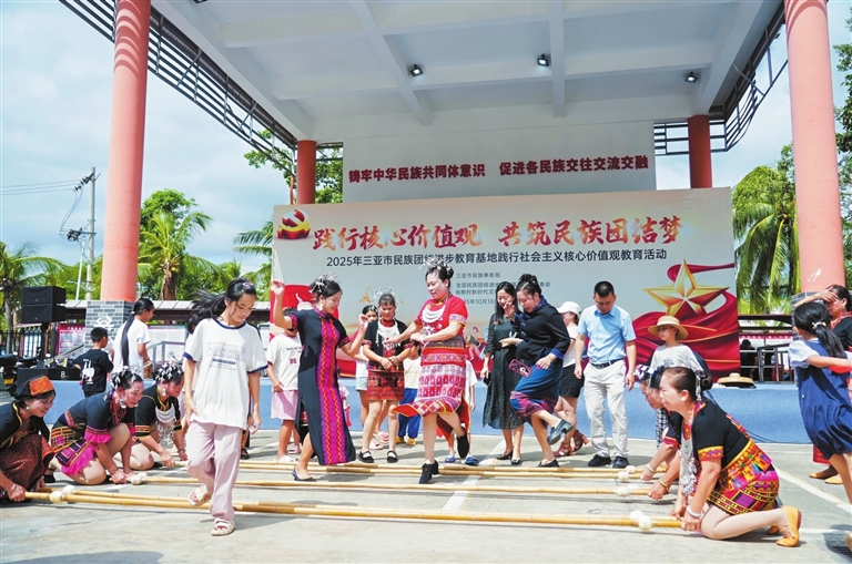 本报讯(记者 黄珍)10月18日,由市民族事务局主办的2025年三亚市民族团结进步教育基地践行社会主义核心价值观教育活动在天涯区槟榔村举办。活动围绕“践行核心价值观 共筑民族团结梦”主题,将践行社会主义核心价值观与民族团结进步宣传教育相结合,通过多元文化活动,搭建起沉浸式感受民族文化魅力的桥梁,共促民族团结。