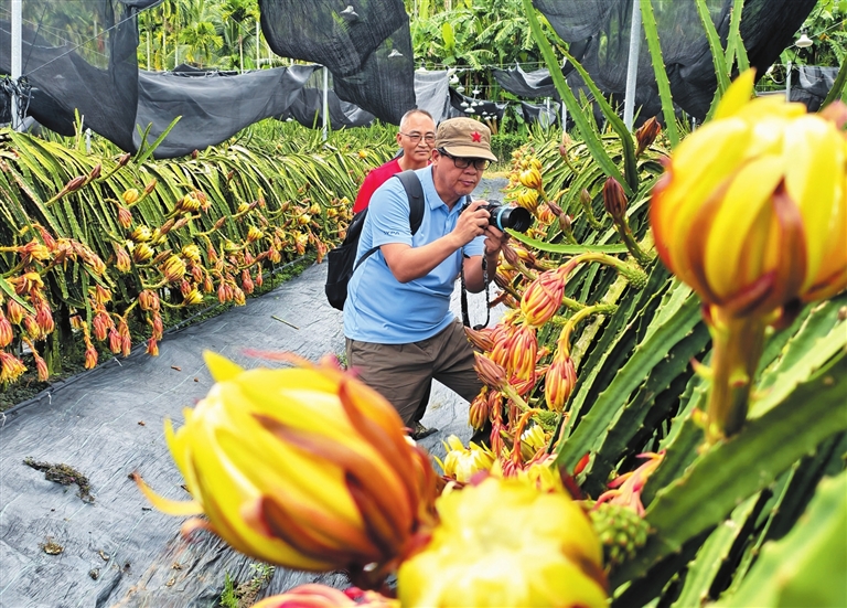 10月22日,三亚天涯区台楼村六罗火龙果基地,燕窝果花竞相盛放,形成一道美丽的风景线,引得游人纷纷驻足观赏、拍照留念。