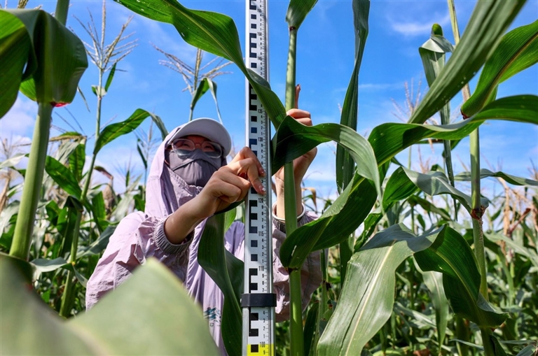 驻扎在三亚大茅村科技小院的中国农业大学研究生穿梭在鲜食玉米丛中测量株高。