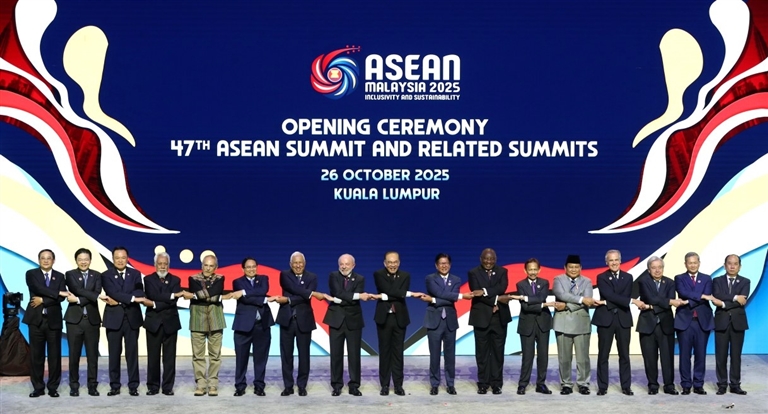 | 10月26日,在马来西亚首都吉隆坡,嘉宾在第47届东盟峰会及系列会议开幕式上合影。 新华社记者 岑云鹏 摄 |