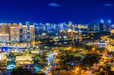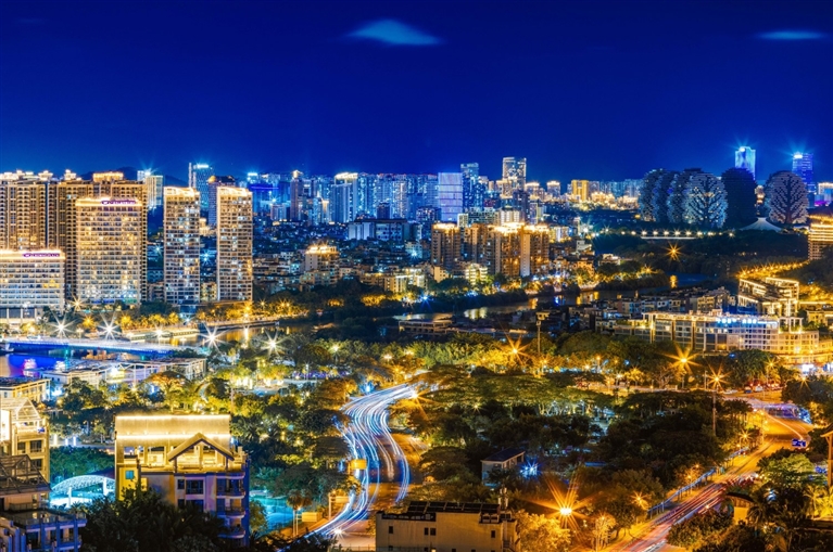 | ② 登临春岭森林公园瞭望塔远眺,三亚主城区灯火如织,流动的车灯与璀璨的楼宇交相辉映,勾勒出城市夜晚的蓬勃生机。 |