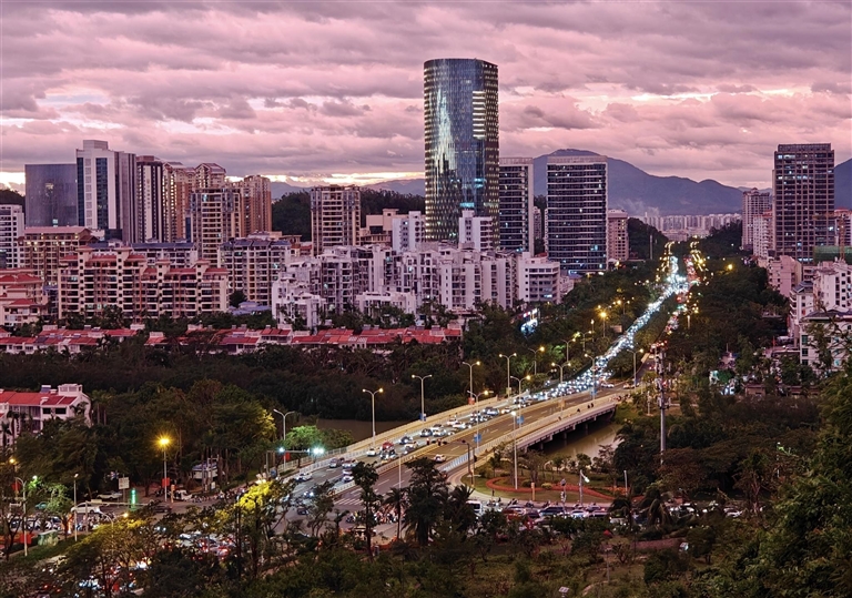 | ④ 在临春岭环山步道俯瞰三亚中央商务区,粉色晚霞映照天空,与地面车水马龙的流光相互映衬,尽显城市日暮时分的独特韵味。 |
