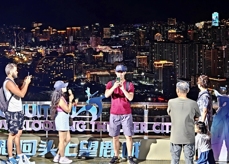 | ⑥ 鹿回头上望鹿城,几位国际游客以璀璨的城市夜景为背景,用手机记录下这难忘的瞬间。 |