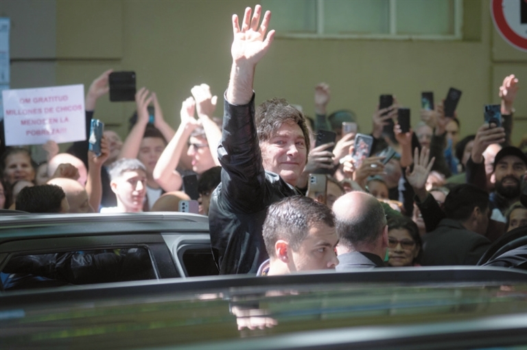 10月26日,阿根廷总统米莱(中)在布宜诺斯艾利斯一处投票点外向选民挥手致意。