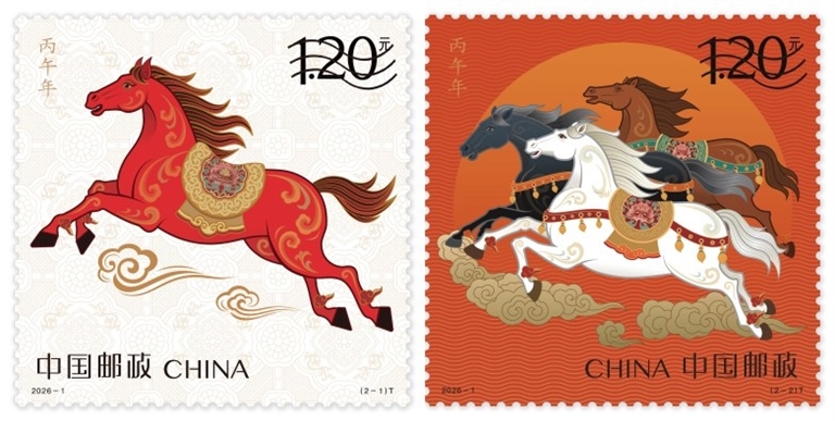 《丙午年》特种邮票由王红卫、赵恩重设计。邮票第一枚图名为“驰跃宏图”,以“腾跃新时代”为核心意象。第二枚图名为“万骏臻福”,以“万马奔腾,驰骋千里”为核心意象。该套特种邮票将于2026年1月5日正式发售。