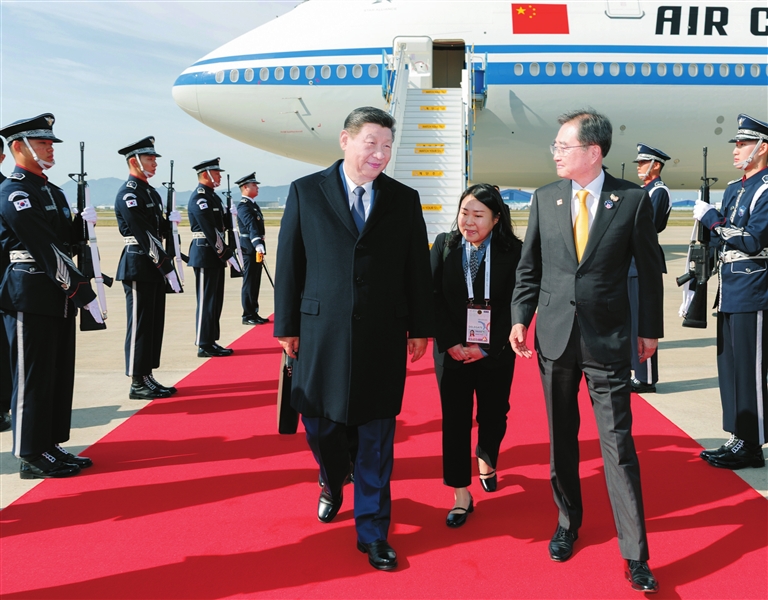 习近平抵达釜山金海国际机场时,韩国外长赵显等高级官员热情迎接。礼兵分列红地毯两侧致敬,军乐团演奏行进乐,机场鸣放21响礼炮。