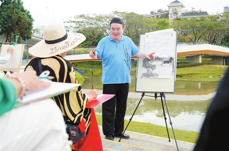 来自山东淄博的韩义,他不仅是山东省美术家协会会员,还担任中国山水画创作院海南分院院长。退休后,他成为三亚“候鸟”群体中的一员,他与老伴在10年前选择定居三亚。“最初是气候吸引了我,但真正让我留下的,是这座城市让人无法抗拒的魅力。现在这里就是家。” 韩义说。
