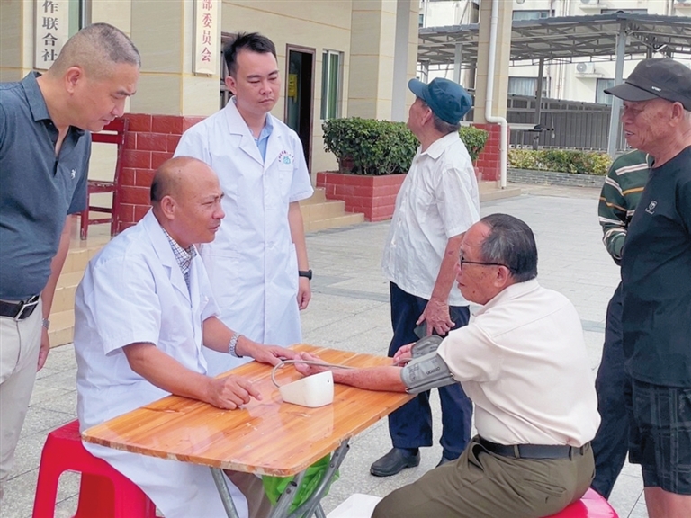 一大早,村委会满是忙碌的身影:有人搬着节日礼品脚步轻快,有人踩着梯子挂横幅干劲十足,场地布置的小细节里,满满都是对老人的贴心关怀。村卫生室的医生早早就守在便民服务大厅前,免费帮老人测血压,轻声细语询问“最近睡眠怎么样”“药按时吃了吗”,把健康守护稳稳送到老人们身边。