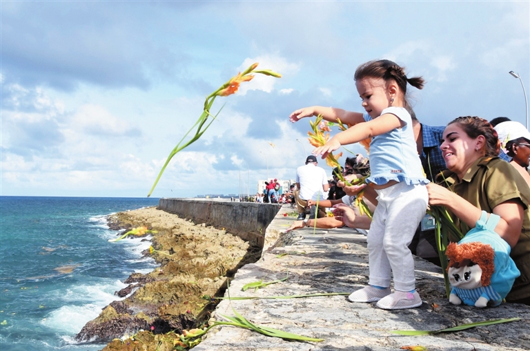 10月28日,在古巴首都哈瓦那海滨大道,一名小女孩在家人的陪伴下向海中抛撒鲜花,纪念古巴革命英雄卡米洛·西恩富戈斯遇难66周年。