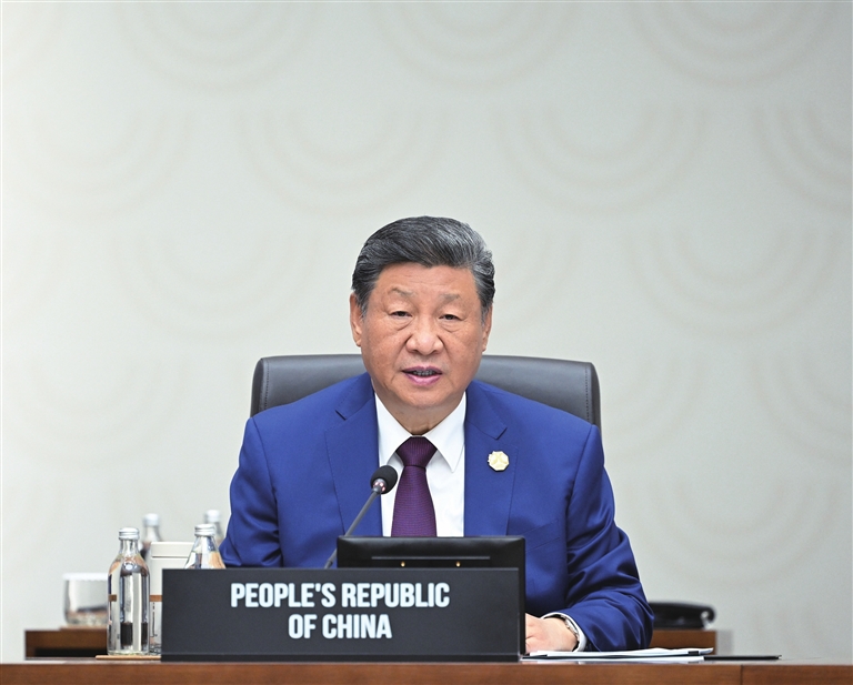 当地时间11月1日上午,国家主席习近平在韩国庆州出席亚太经合组织第三十二次领导人非正式会议第二阶段会议,并发表题为《共同开创可持续的美好明天》的重要讲话。新华社记者 谢环驰 摄