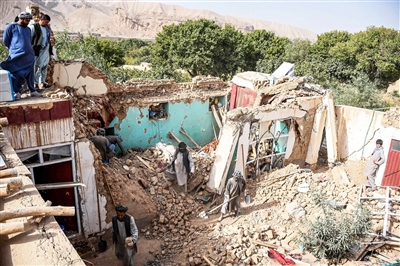 11月3日,在阿富汗北部萨曼甘省,当地居民在地震后查看受损的房屋。