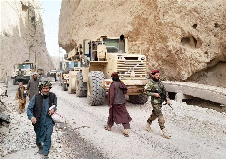 11月3日,在阿富汗胡勒姆地区,大型机械车辆前往地震灾区救援。
