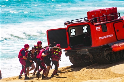 | 消防救援人员用双节履带式多功能全地形车转运获救人员。 |