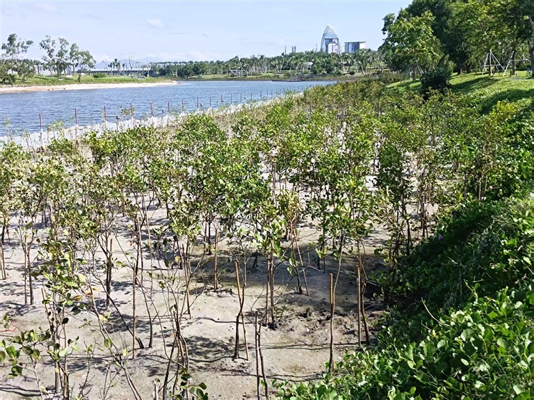 三亚迅速响应,在海棠河两岸采取开挖排水沟槽、设置挡土围堰等工程措施,改变拉关木赖以生存的水盐环境,构筑生态隔离带。随后,在清理出的滩涂上及时补种白骨壤、角果木、红榄李、黄槿等17种本土红树及半红树苗木,让这些“生态原住民”重新扎根。同时,通过设立防护网,有效阻挡外来植物再次随潮水入侵。