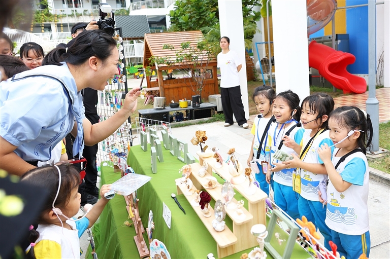 | 市第一幼儿园的小朋友向参会专家、教师展示亲手制作的手工文创产品。 本报记者 李学仕 摄 |