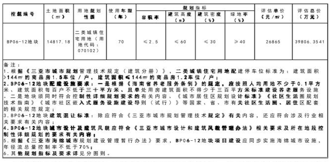 本次挂牌出让宗地位于三亚抱坡片区控规BP06-12地块,面积14817.18平方米,用地四至及界址坐标详见地块勘测定界图。经核查《三亚市国土空间总体规划(2021-2035年)》“三区三线”划定成果,该宗地位于城镇开发边界(城镇集中建设区)内,不涉及占用永久基本农田和生态保护红线。同时,经核查《三亚抱坡片区控制性详细规划》,该宗地规划用地性质为二类城镇住宅用地(市场化商品住房)(用地代码:070102)。