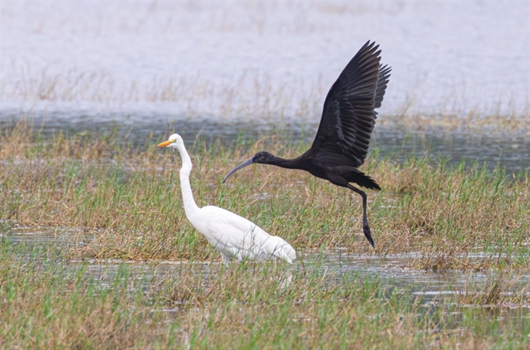 在海南昌江海尾国家湿地公园拍摄的彩鹮(右)与鹭鸟(11月5日摄)。