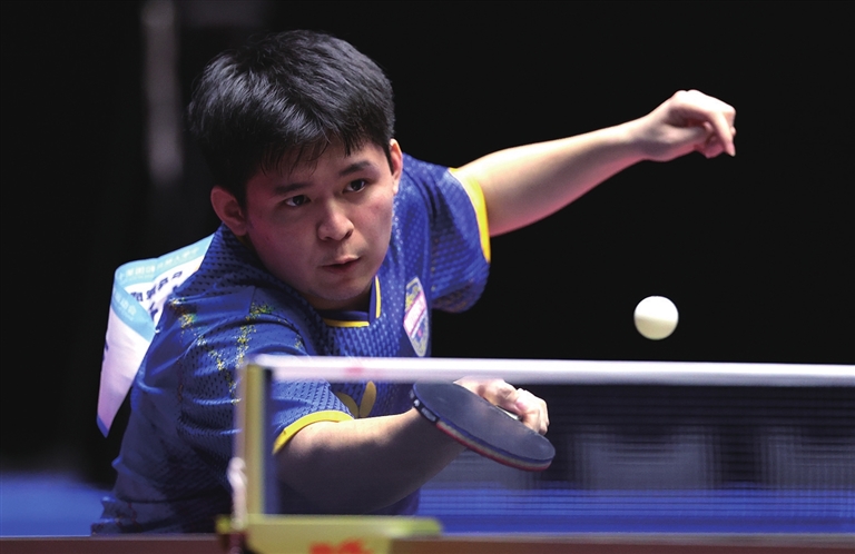 当日,在澳门举行的第十五届全国运动会乒乓球男子单打四分之一决赛中,海南队选手林诗栋4比1战胜上海队选手赵子豪,晋级四强。新华社记者 梁旭 摄