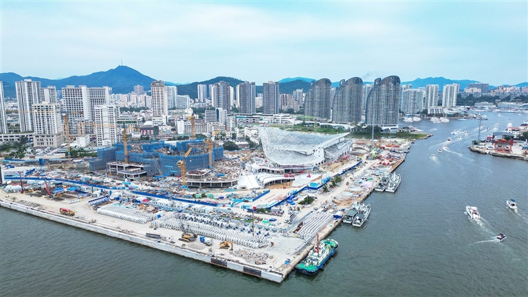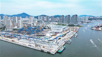 | 十一月十四日,航拍海南三亚国际邮轮港一期客运枢纽项目(施工)二标段总承包项目工地。 本报记者 陈聪聪 摄 |