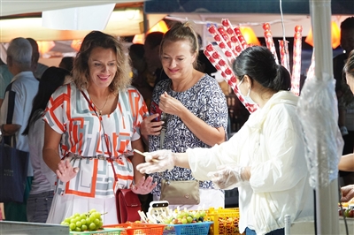 美食区更是人潮涌动,香气四溢。来自爱沙尼亚的游客马伊特手拿烤鱿鱼,兴奋地穿梭在各个摊位间。“这是我第一次来三亚,没想到除了美丽的海景,还能体验到如此丰富的文化交流。湖北热干面、新疆烤串、湖南臭豆腐,这些地道的中国美食让我感受到了真正的中国美食文化。”