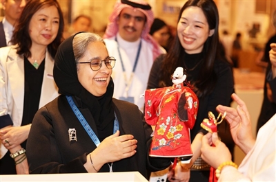 11月13日,在沙特首都利雅得,嘉宾在第三届沙特阿拉伯国际手工艺周中国馆欣赏木偶。