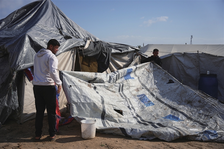 阿迈勒·阿布·哈桑和她的四个孩子因冲突流离失所,现住在加沙地带北部加沙城一顶帐篷里。她接受记者采访时说,他们遭遇涝灾,地面和仅有的家当都被浸泡。“整个晚上我都在努力排掉涌入帐篷的雨水,不停挪动孩子的位置……但一切努力都没用,雨水从四面八方渗入,被褥全湿透了。孩子们又冷又怕,哭个不停。”