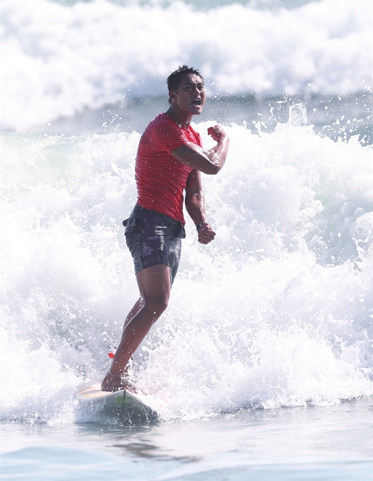 当日,在广东南澳举行的第十五届全国运动会冲浪男子短板决赛中,海南队选手吴世栋战胜河北队选手董子豪,夺得冠军。
