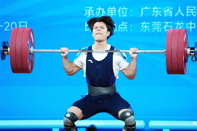 11月17日,浙江队选手陈戬在挺举比赛中。最终,他获得冠军。