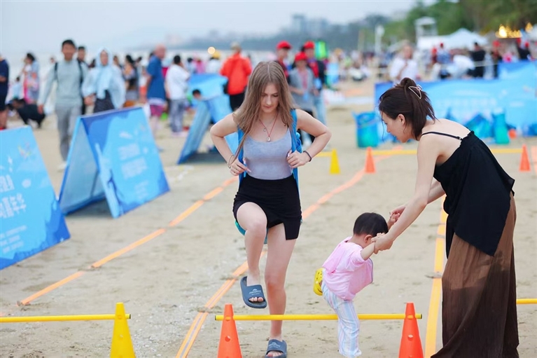参与者自由选择关卡挑战,在柔软的沙滩上奔跑、跳跃、投掷,尽情挥洒汗水,享受运动带来的乐趣。“没想到在三亚旅游还能参与这么有趣的活动!”来自成都的游客陈先生带着8岁的儿子刚完成“两人三足”挑战,兴奋地表示,“和孩子在沙滩上并肩作战,海风扑面而来,这才是真正的度假体验!”