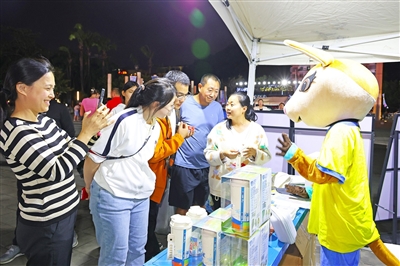 晚上8时许,活动现场气氛热烈,知名乐队演唱、DJ电音派对、海岛风情表演等精彩节目轮番上演,不时穿插酒王争霸赛、摇一摇抽奖等互动环节,海风与酒香交织,电音旋律点燃全场。三亚亚沙会元素的加入也成为当晚一大亮点。以海南坡鹿为原型的吉祥物“亚亚”灵动亮相,时而与小朋友击掌互动,时而摆出运动造型与市民游客合影。现场的三亚亚沙会特许文创展区内,茶杯、玩偶、冰箱贴、笔记本、徽章等特许商品琳琅满目,整齐摆放在主题展台上,吸引不少观众驻足了解。“‘亚亚’的设计太可爱了,买一个玩偶带回去做纪念,也算是提前为三亚亚沙会加油。”三亚市民李女士拿着刚选购的吉祥物玩偶说。三亚亚沙会执委会市场开发部特许经营处处长赵强介绍,目前已完成10大类、70余款特许商品的研发,覆盖贵金属制品、纪念邮品、吉祥物“亚亚”系列毛绒玩具、文具类等,能满足赛事纪念、日常消费、礼品馈赠等多元需求。所有产品均深度融入海南地域特色与沙滩运动主题,实现文化传播与市场吸引力的双重提升。