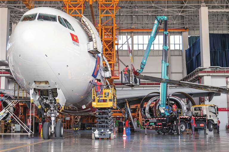 海南自贸港一站式飞机维修产业基地自2022年投产以来,截至今年10月底,已完成超2400架次飞机维修、超280架次整机喷涂及6.1万件航空零部件维修,服务覆盖国内外近50家航空公司及飞机租赁公司。