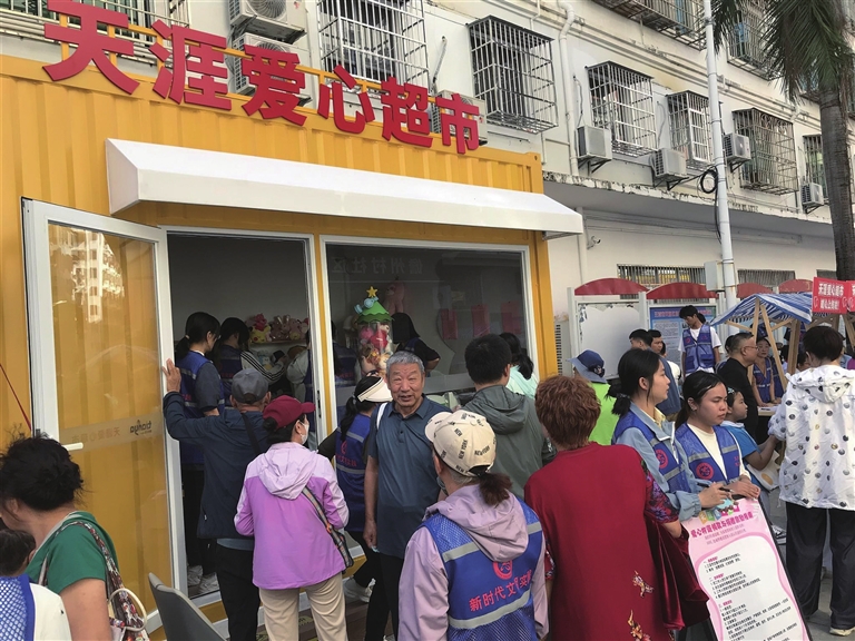 天涯爱心超市位于天涯区儋州村社区儋州一巷(儋州村社区居委会对面),每周一至周日常态化开放(上午8:30-12:00、下午15:00-18:00),打造四大暖心平台覆盖多元需求:爱心循环站募集居民闲置衣物、生活用品等物资,经消毒后免费赠予有需要的群众,促进资源循环与邻里温情凝聚;流动服务窗每月开展“爱心流动集市”,提供理发、义诊、政策咨询等服务,破解老年群体和行动不便群众“办事难”问题;天涯暖心角为环卫工人、快递员等户外工作者免费提供饮水、热饭、充电等服务;文明风尚台展示志愿服务动态、宣传先进事迹,弘扬志愿精神,引导群众参与公益。