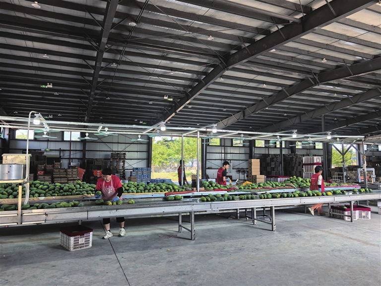 近年来,三亚木瓜凭借优良品种和过硬技术,坚持高品质,形成独特市场竞争力。为规范出货标准,采摘后的果实统一运至三亚木瓜超级工厂,进行二次分拣、装箱和打包。该工厂是产业源头,也是省外客商常来“蹲点”采购的地方。